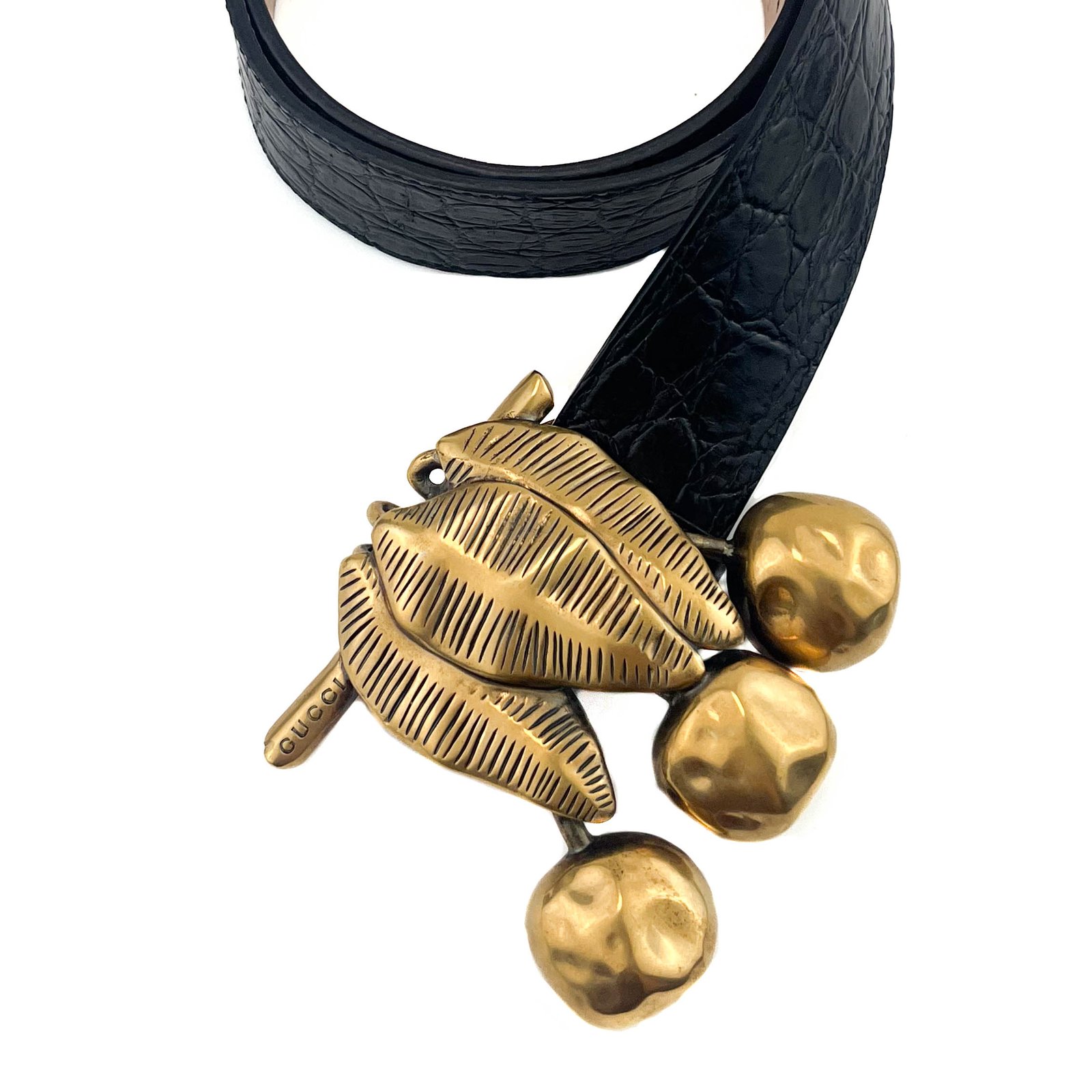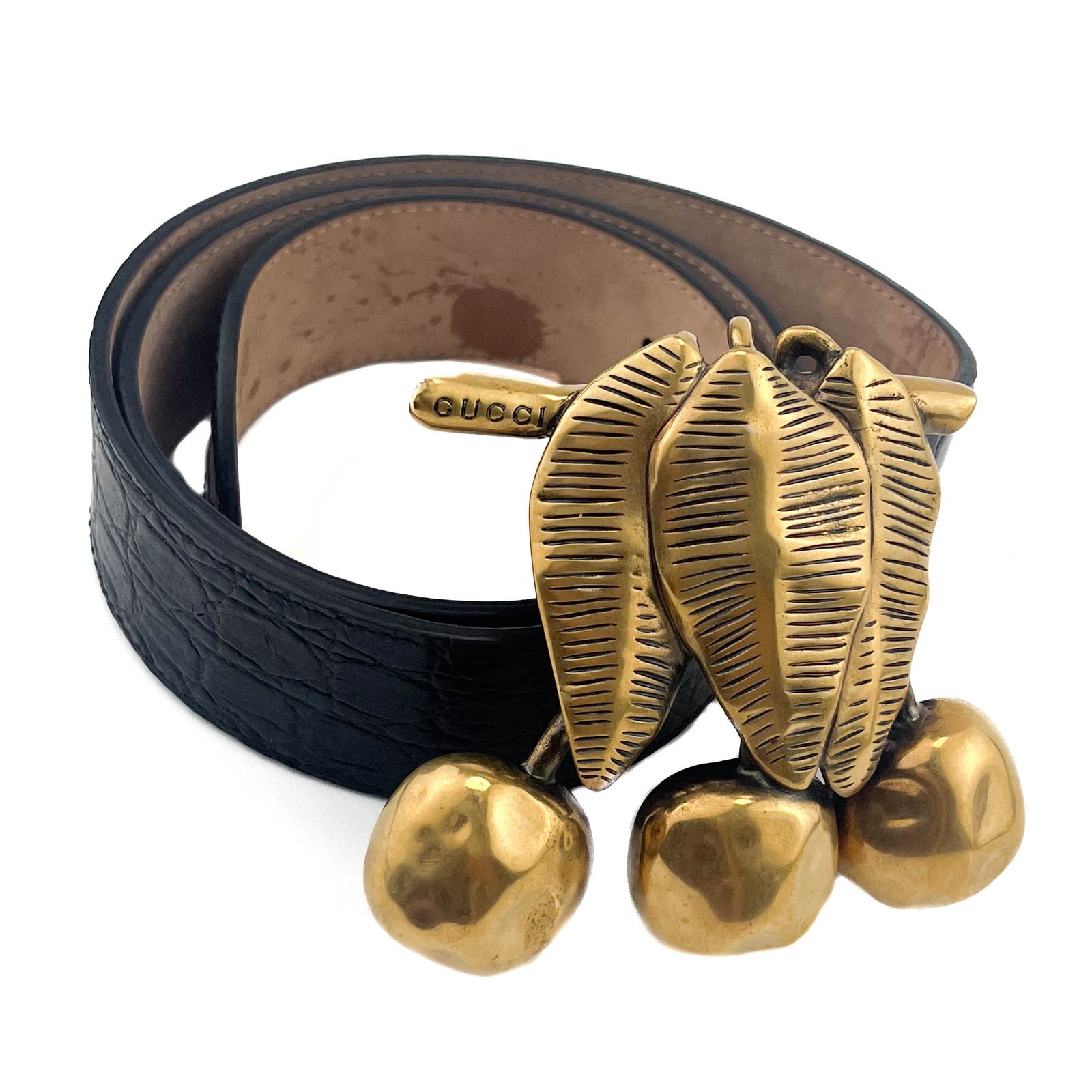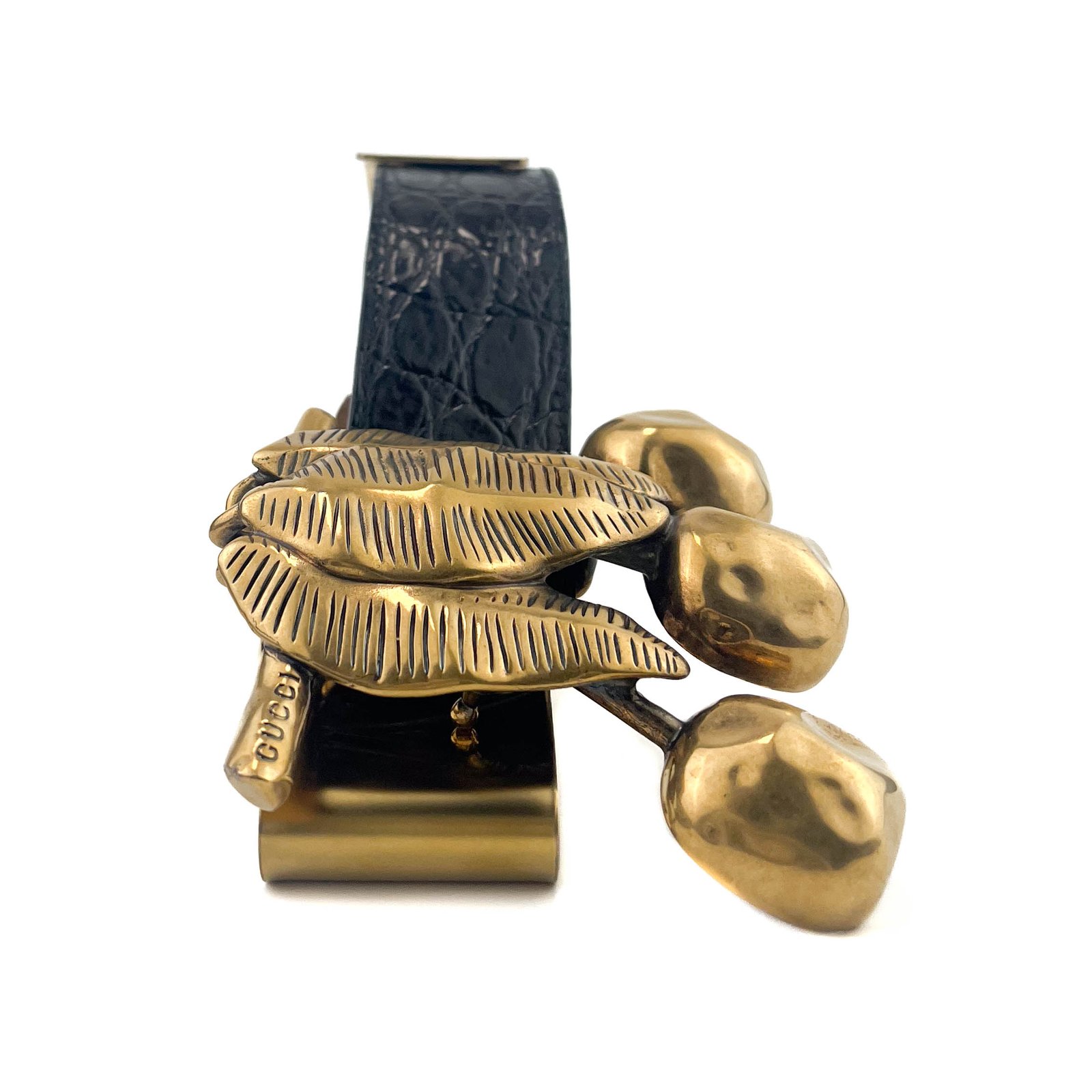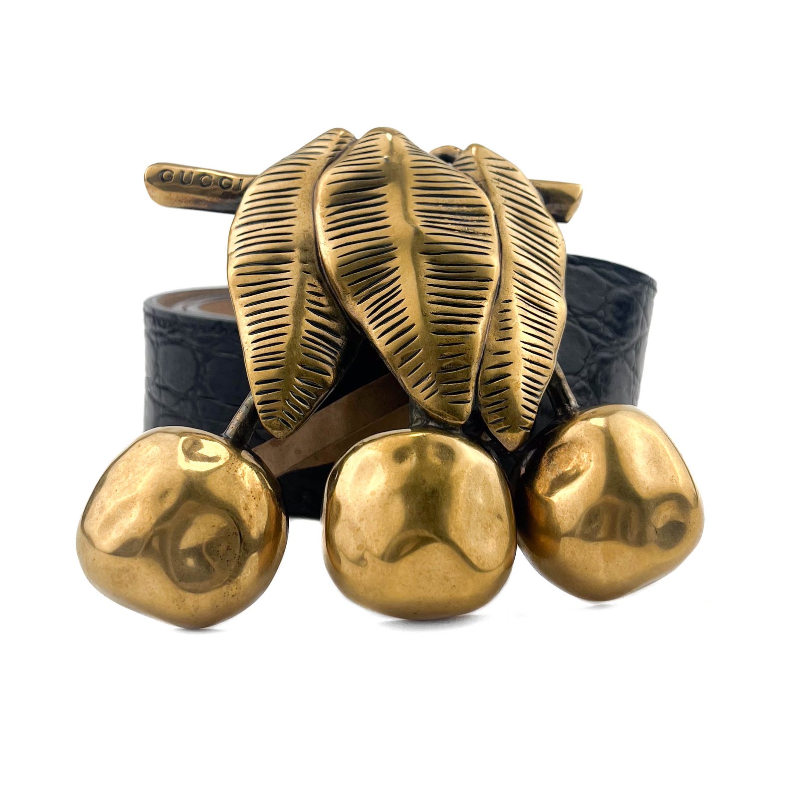 - Dettagli: Cintura Gucci in pelle nera decorata con una fibbia iconica a forma di ciliegia dorata. Un accessorio unico e raffinato che aggiunge un tocco di eccentricitĂ e stile ai tuoi outfit. Ideale per chi ama i dettagli esclusivi e ricercati.