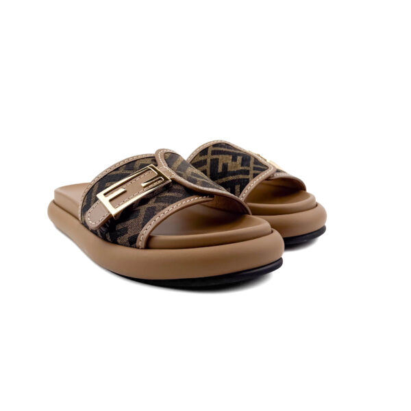 Dettagli: I Sandali slides con logo di Fendi uniscono comfort e stile in un design elegante. Realizzati con una fascia in tessuto jacquard marrone e beige decorata con il classico motivo FF, sono impreziositi da una fibbia dorata che aggiunge un tocco sofisticato. La suola imbottita offre massimo comfort, rendendoli perfetti sia per look casual che per outfit più raffinati durante la stagione estiva.