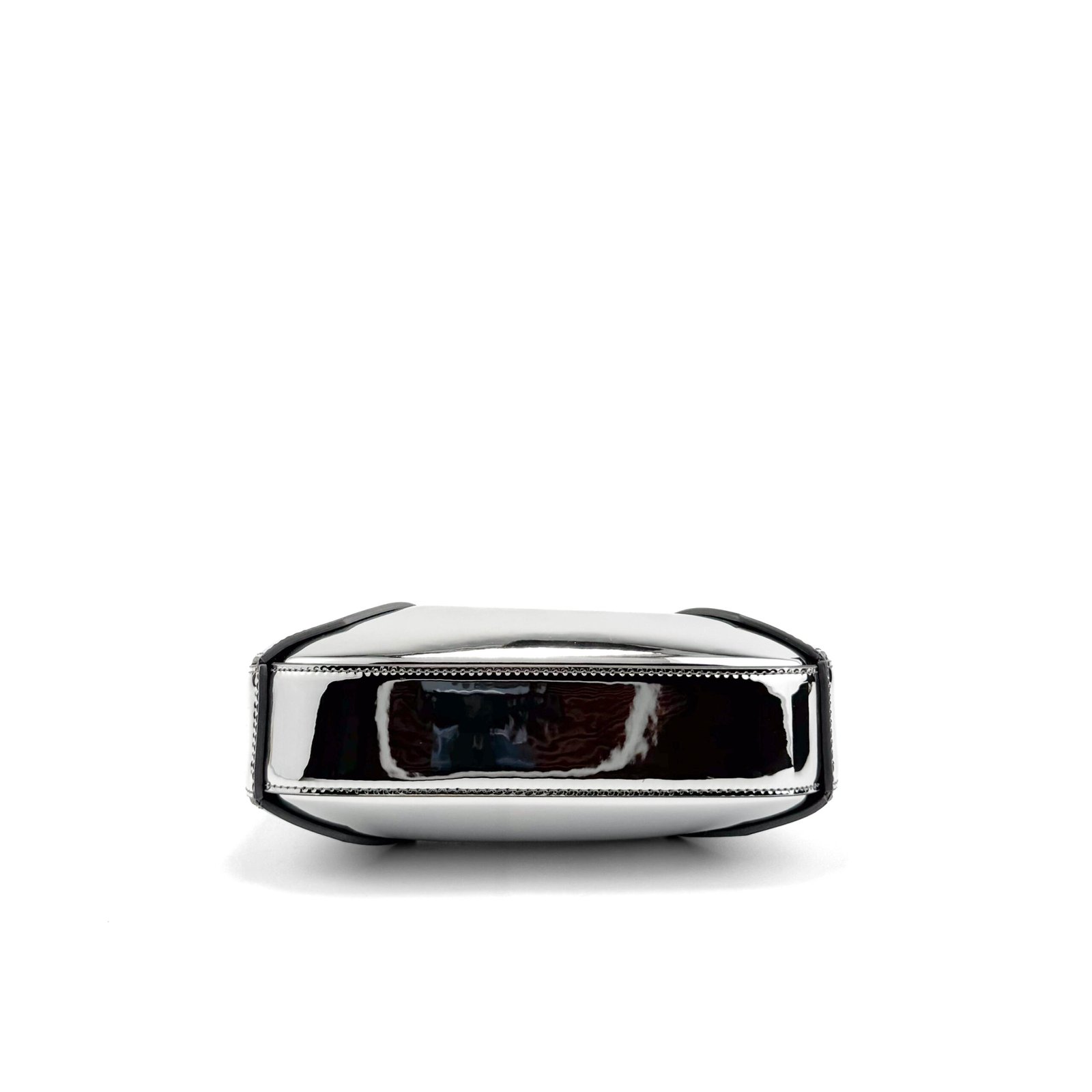 - Materiale: Pelle metallizzata di alta qualità con dettagli in metallo argentato.