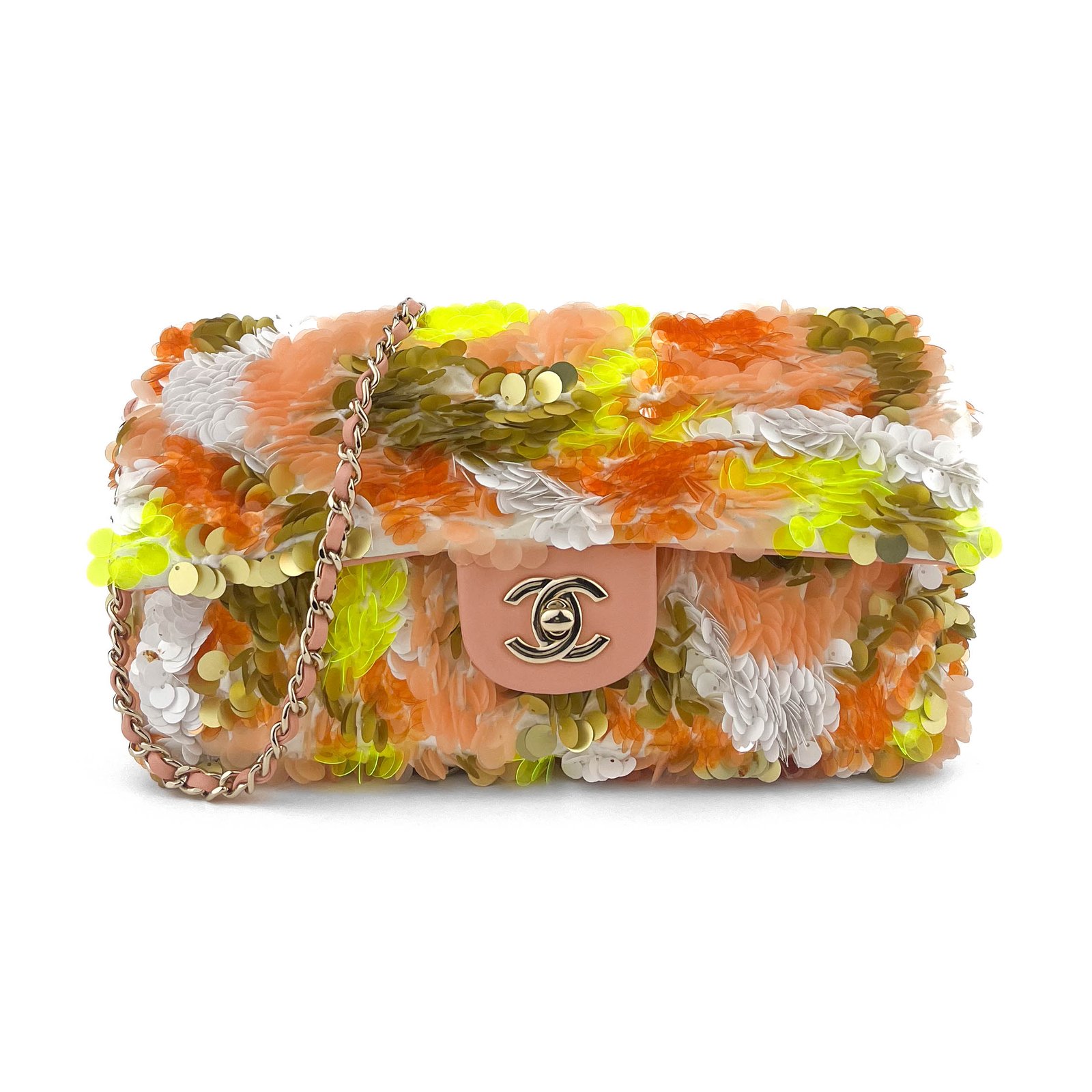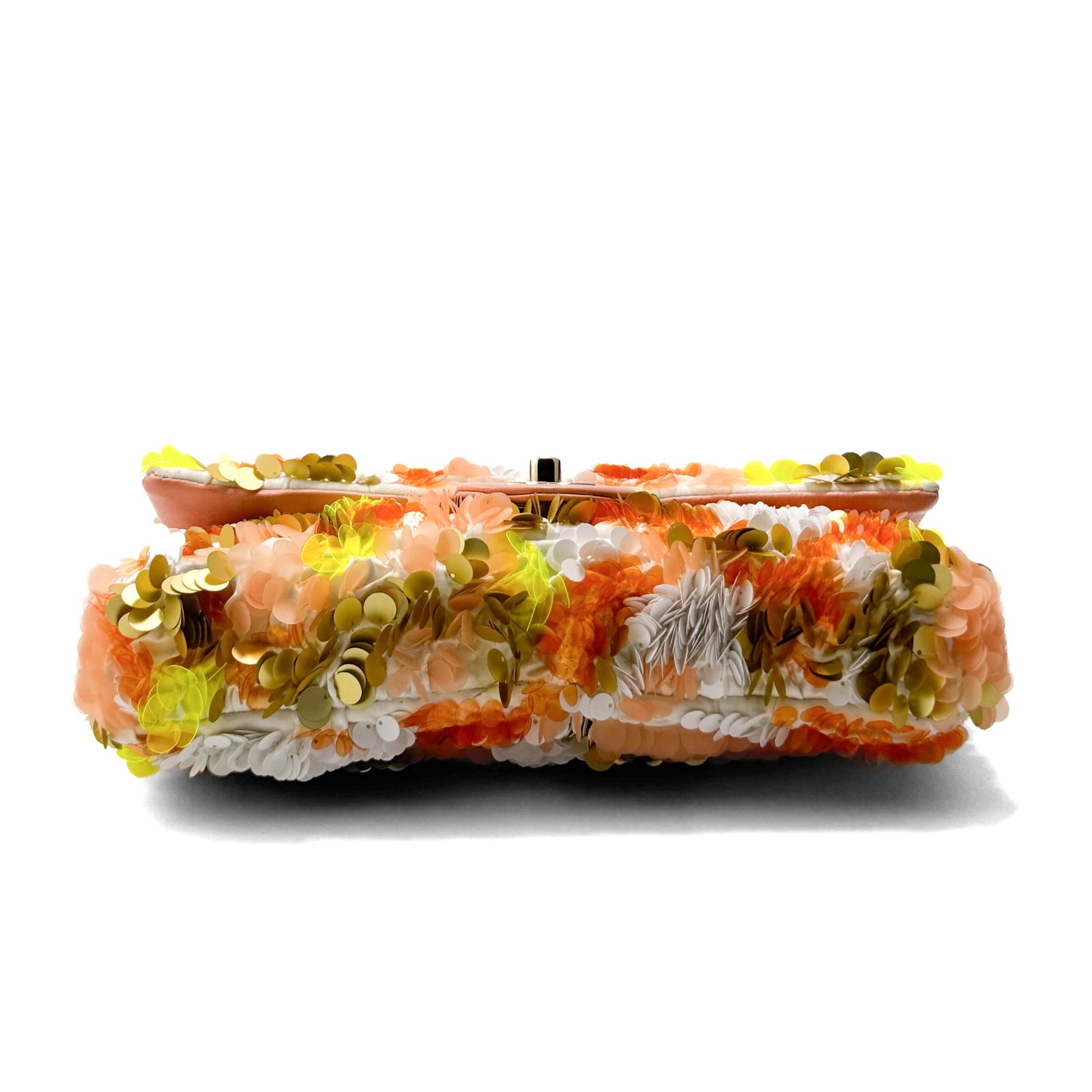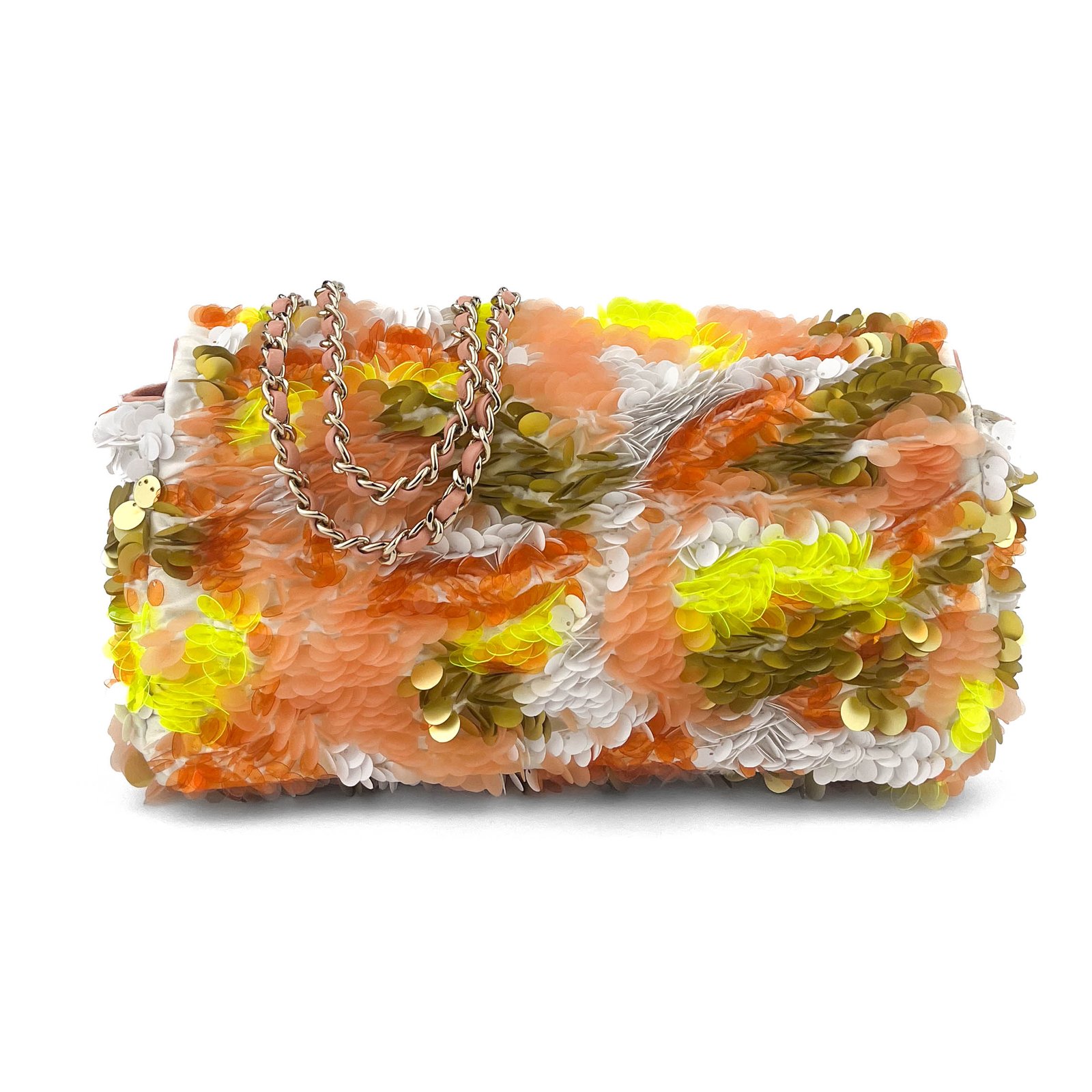 La Chanel Medium Flap Bag in paillettes multicolor è un pezzo accattivante in edizione limitata che ridefinisce il lusso con un tocco giocoso. Adornata con paillettes vibranti e scintillanti in una tavolozza unica di arancione, giallo e bianco, questa borsa trasforma l’iconico design della patta di Chanel in un accessorio da urlo. Dotata dell’inconfondibile chiusura CC con hardware color oro e di una tracolla in pelle e catene, questa borsa in edizione limitata è perfetta per i collezionisti e per chiunque voglia fare un’audace dichiarazione di moda.