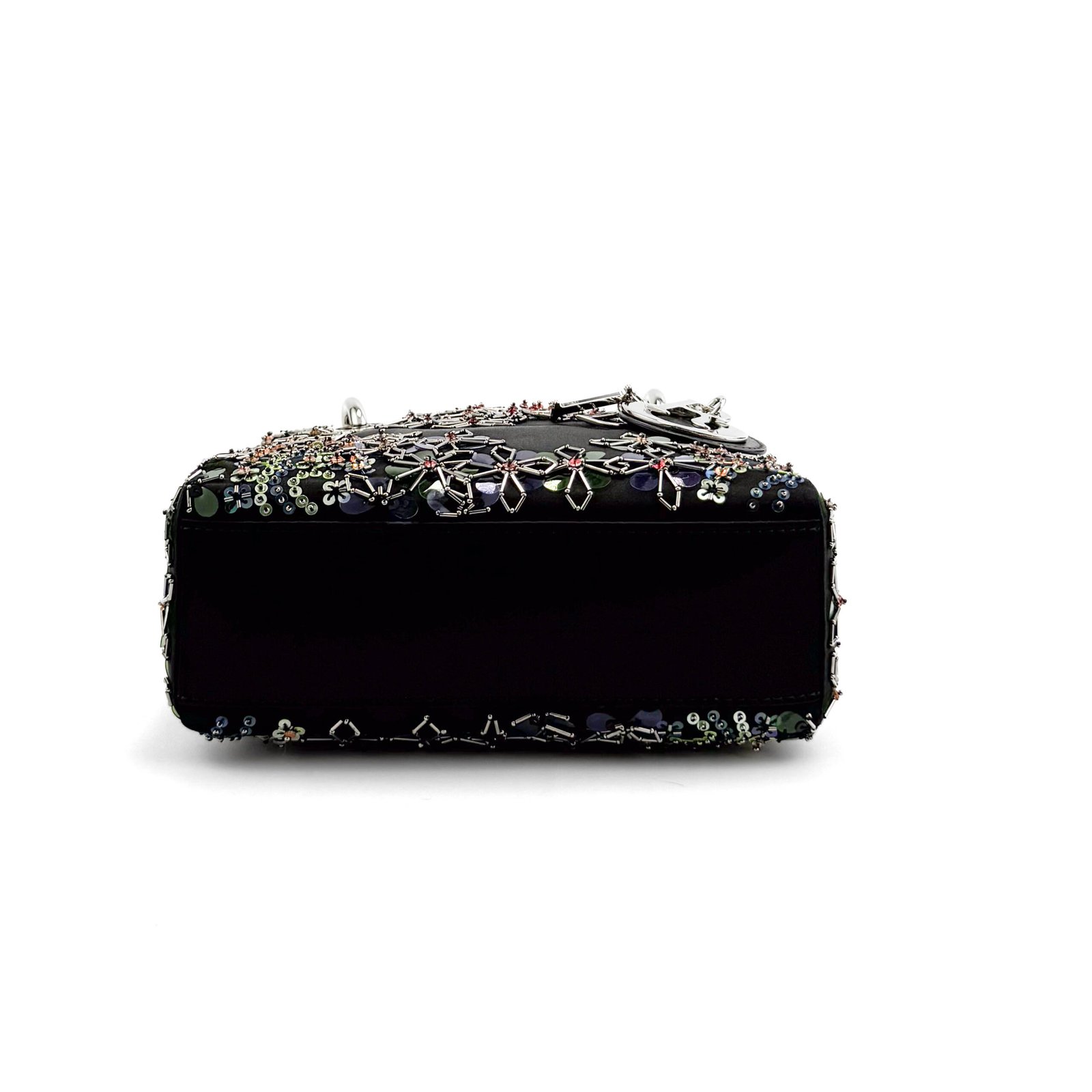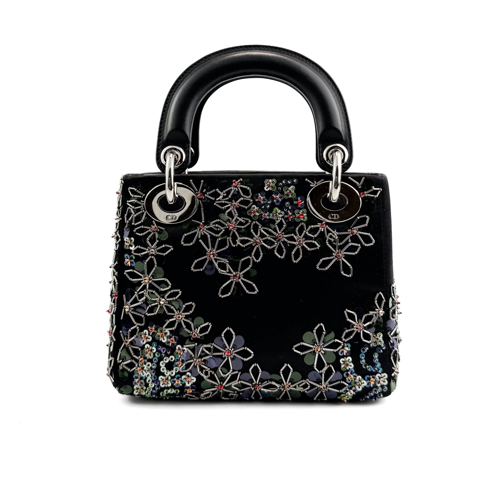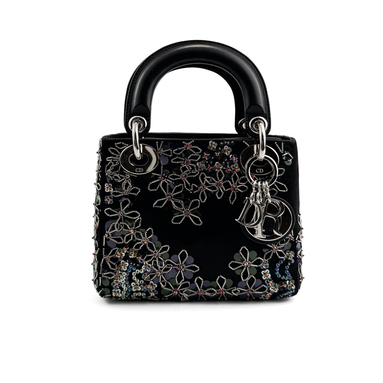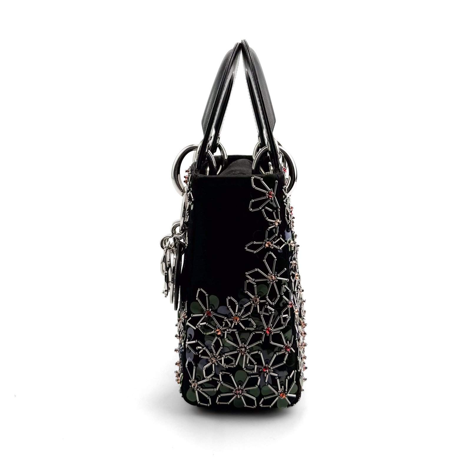La borsa Lady Dior Special Edition è una splendida reinterpretazione della classica silhouette Lady Dior, realizzata in lussuoso velluto nero e impreziosita da intricati decori floreali. Questa edizione unica è decorata con paillettes scintillanti e applicazioni floreali metalliche che creano un aspetto artistico e sorprendente. Gli iconici ciondoli “D.I.O.R” in metallo argentato completano il look, aggiungendo un tocco di classe a questa elegante borsa. Perfetto per le occasioni serali, questo pezzo è un vero e proprio oggetto da collezione per chi è alla moda.