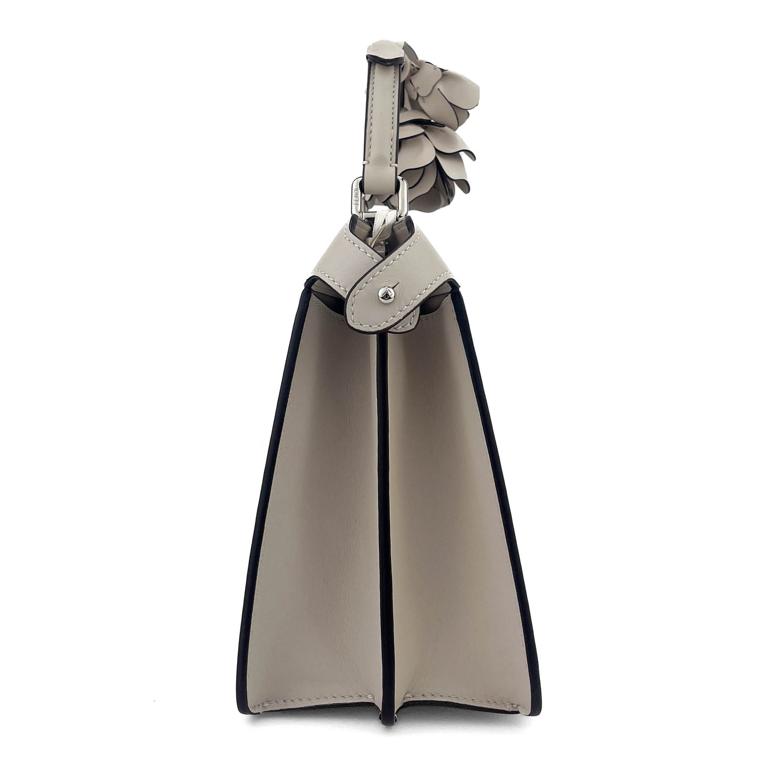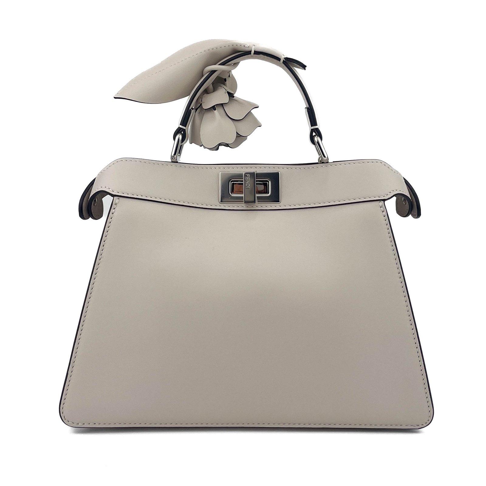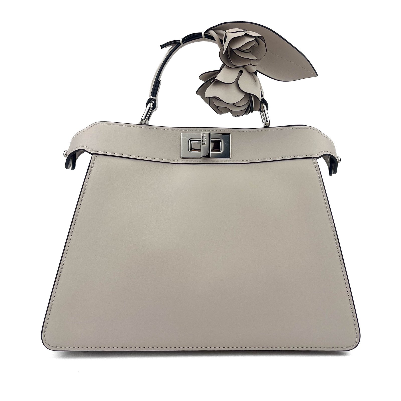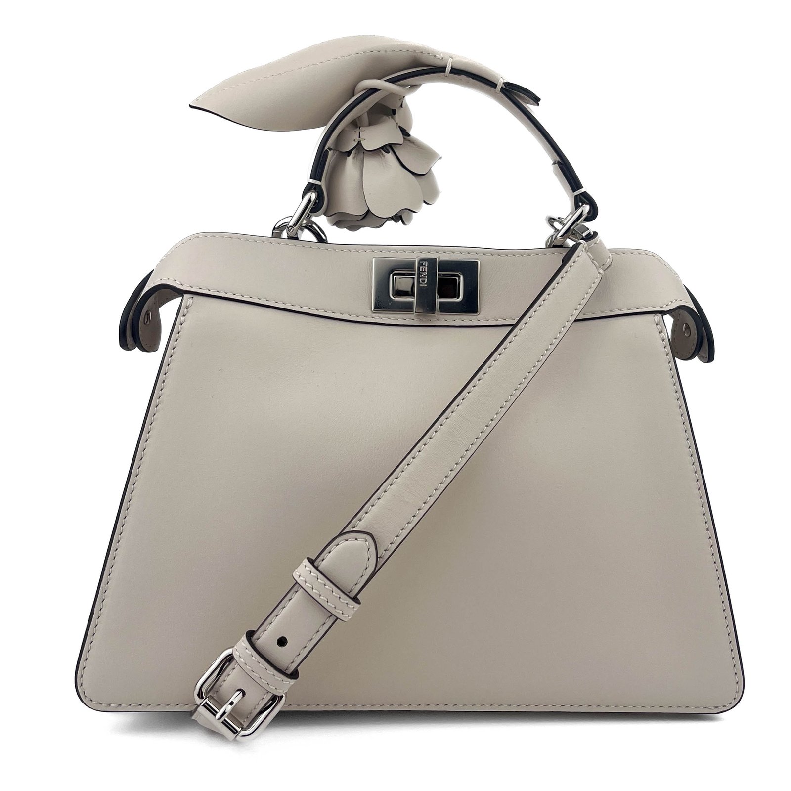 La borsa Peekaboo di Fendi in edizione limitata, in pelle bianca lucida, è un vero pezzo forte. Questa silhouette iconica è impreziosita da un bellissimo dettaglio floreale sul manico, che le conferisce un tocco elegante e femminile. Con la sua caratteristica chiusura twist-lock e i doppi scomparti, questa borsa strutturata unisce senza sforzo lusso e funzionalità. Sia che la si porti con il manico superiore sia che la si indossi a tracolla, la borsa Peekaboo rimane un accessorio senza tempo per ogni guardaroba alla moda.