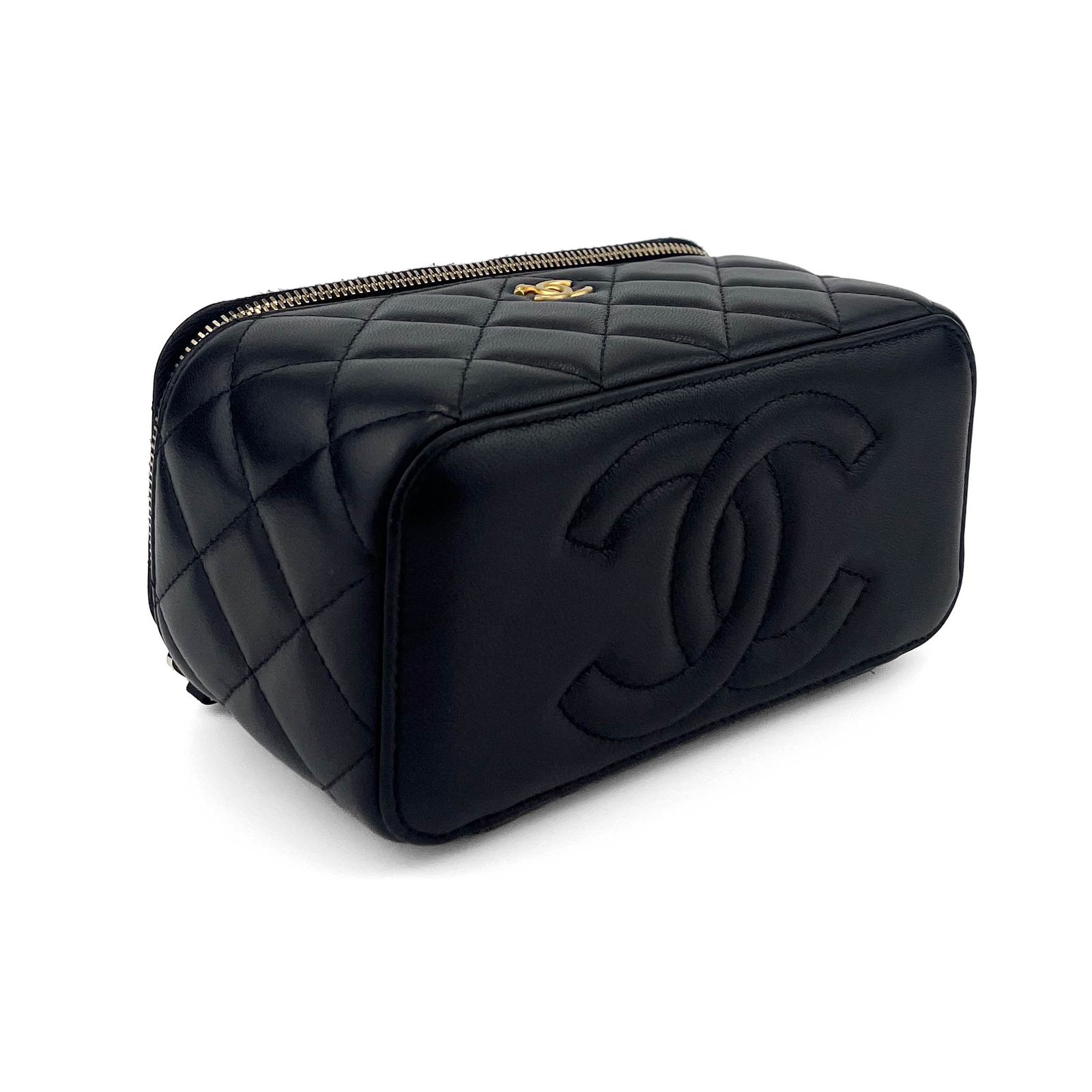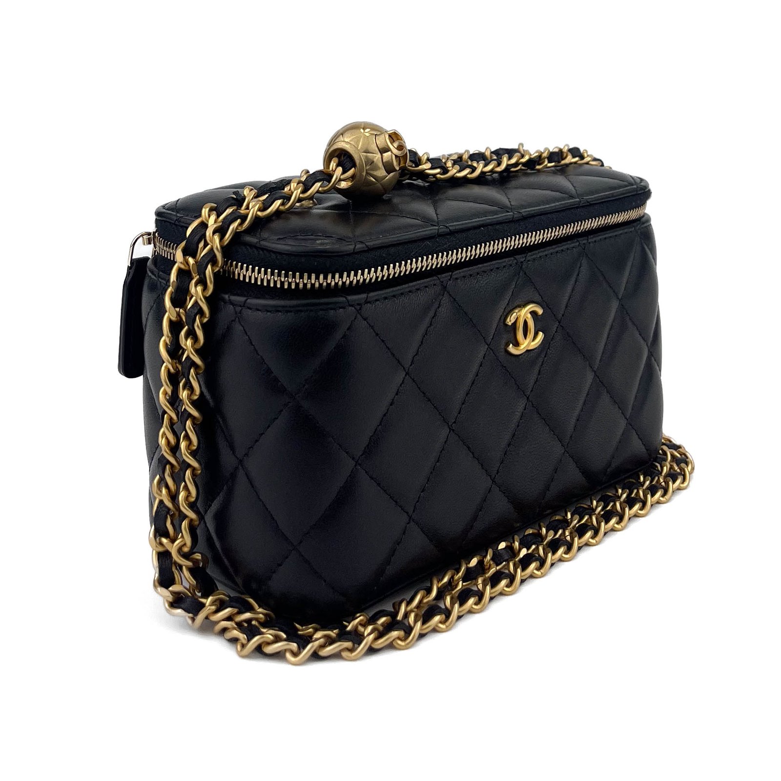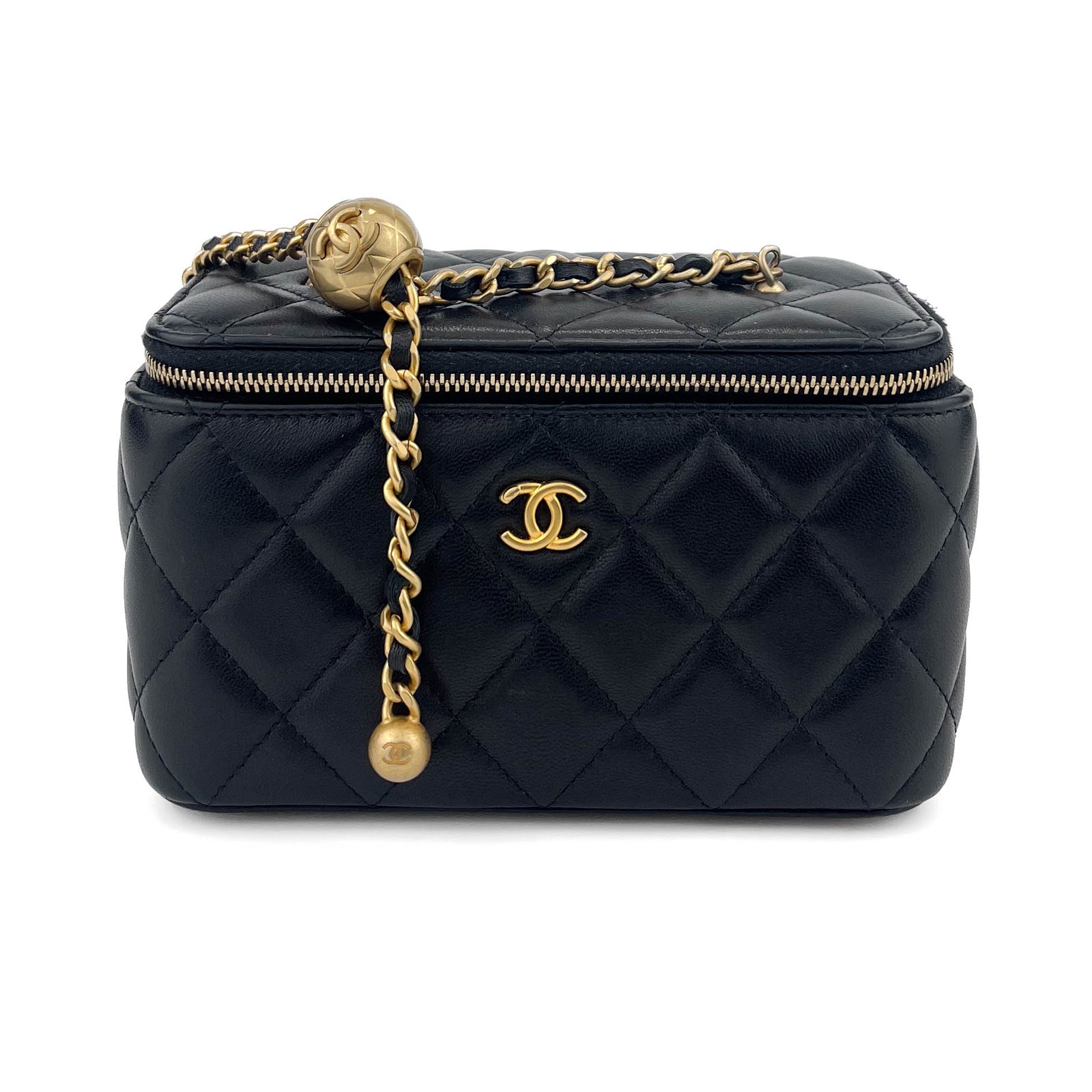 La Chanel Quilted Vanity Bag in pelle di agnello nera è un accessorio lussuoso e versatile, perfetto sia per le uscite casual che per gli eventi serali. Il classico design trapuntato di Chanel è completato da accessori dorati, tra cui l’iconico logo CC sul davanti e un affascinante dettaglio a forma di pallina CC sul tiretto della cerniera. Questa vanity bag compatta è realizzata in morbida pelle di agnello e offre eleganza sia nello stile che nella funzionalità. È dotata di una tracolla a catena che permette di indossarla a spalla o a tracolla, rendendola un pezzo indispensabile per ogni amante di Chanel.