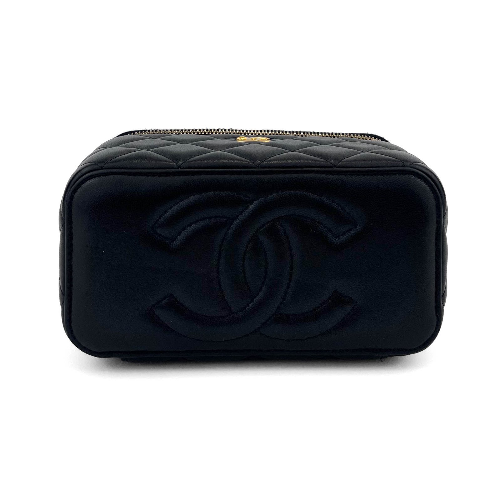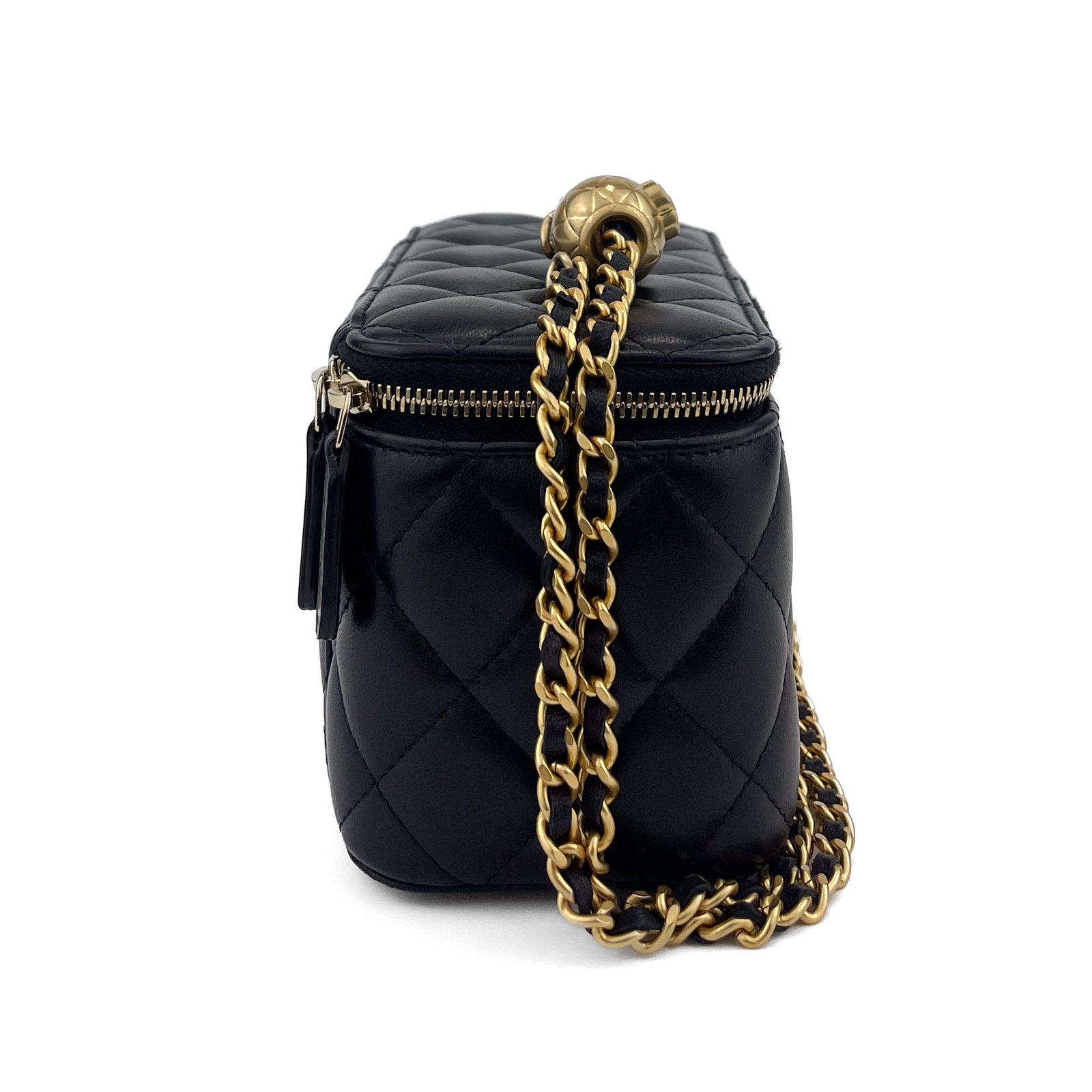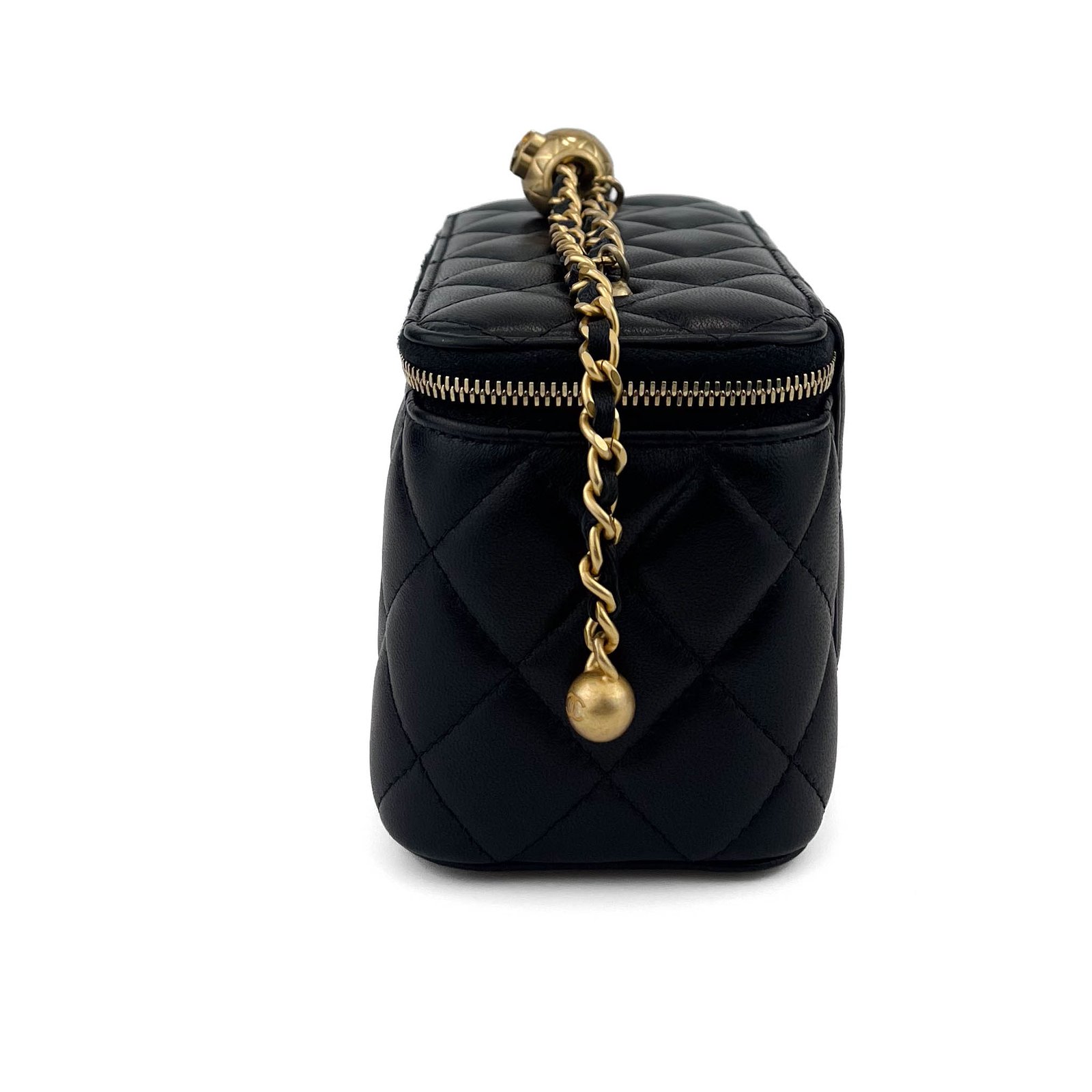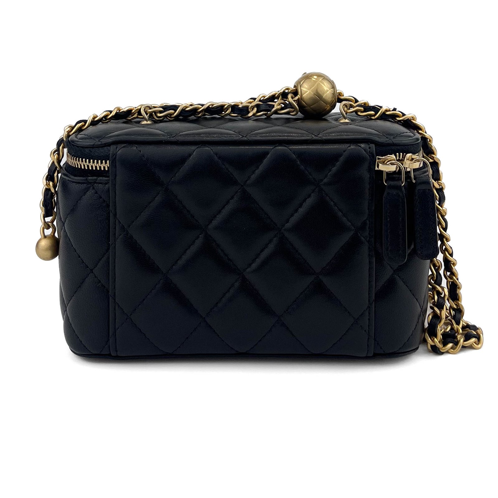 La Chanel Quilted Vanity Bag in pelle di agnello nera è un accessorio lussuoso e versatile, perfetto sia per le uscite casual che per gli eventi serali. Il classico design trapuntato di Chanel è completato da accessori dorati, tra cui l’iconico logo CC sul davanti e un affascinante dettaglio a forma di pallina CC sul tiretto della cerniera. Questa vanity bag compatta è realizzata in morbida pelle di agnello e offre eleganza sia nello stile che nella funzionalità. È dotata di una tracolla a catena che permette di indossarla a spalla o a tracolla, rendendola un pezzo indispensabile per ogni amante di Chanel.