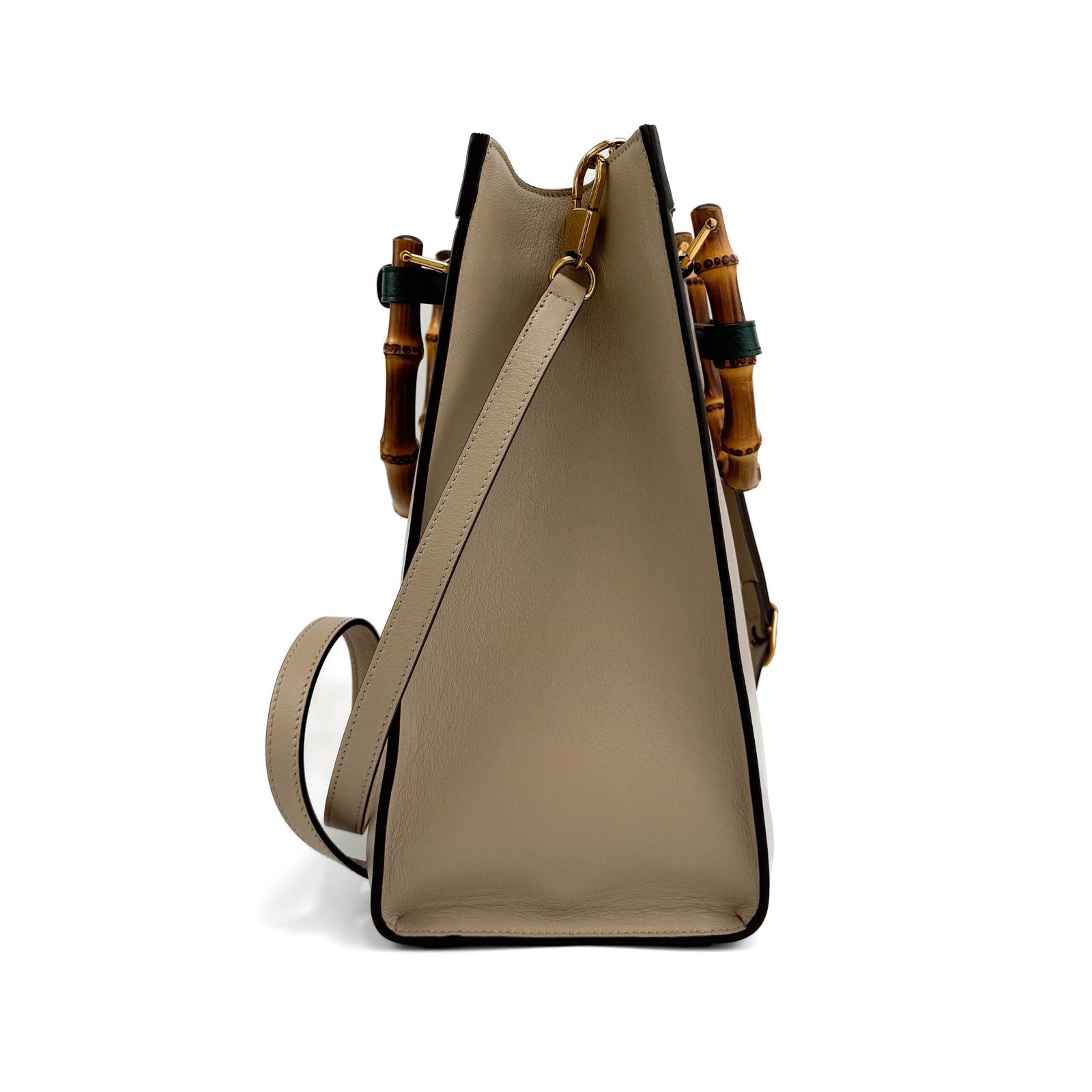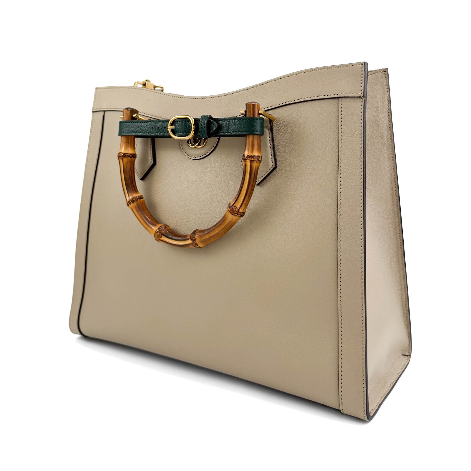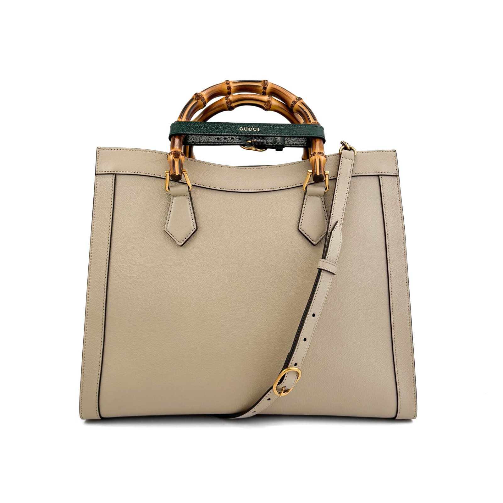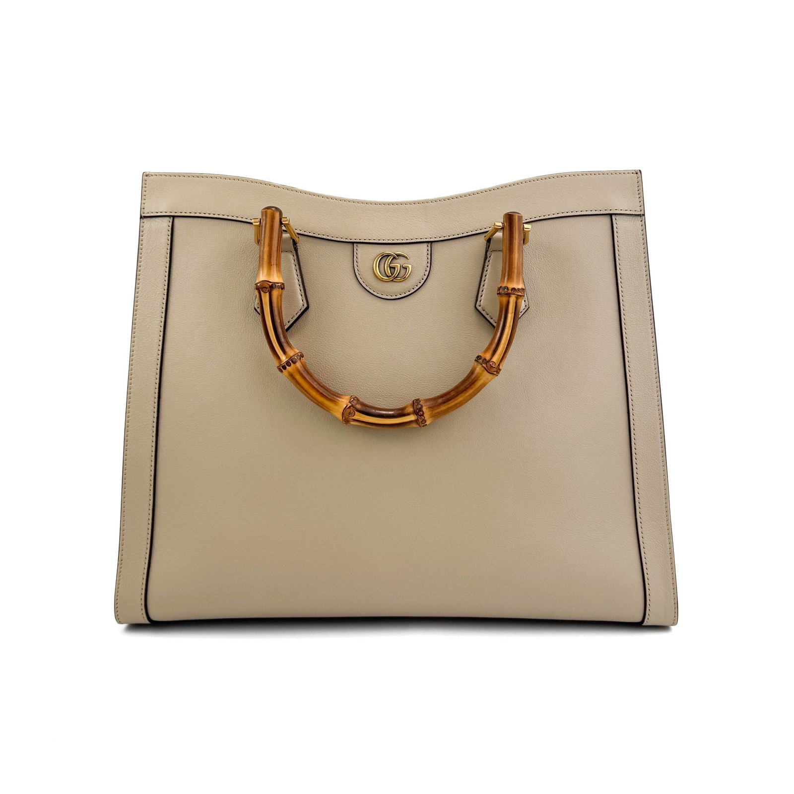 La borsa Diana Medium Tote di Gucci in pelle beige è una splendida miscela di design classico e contemporaneo. Caratterizzata dagli iconici manici superiori in bambù di Gucci, questa tote strutturata emana un’eleganza senza tempo. La pelle beige neutra abbinata alle finiture dorate garantisce versatilità, mentre la tracolla staccabile offre diverse opzioni di trasporto. Che tu stia andando in ufficio o in giro per la città, la borsa Diana è l’accessorio perfetto per elevare qualsiasi outfit.